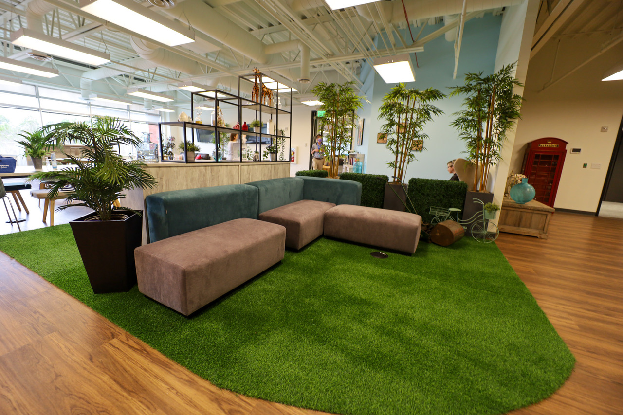 With exposed ceilings, the space aims at an urban vibe and hearkens back to Moneypenny’s whimsical Welsh headquarters, which boasts a treehouse flanked by giraffe sculptures and bean bag chairs in a central gathering space.