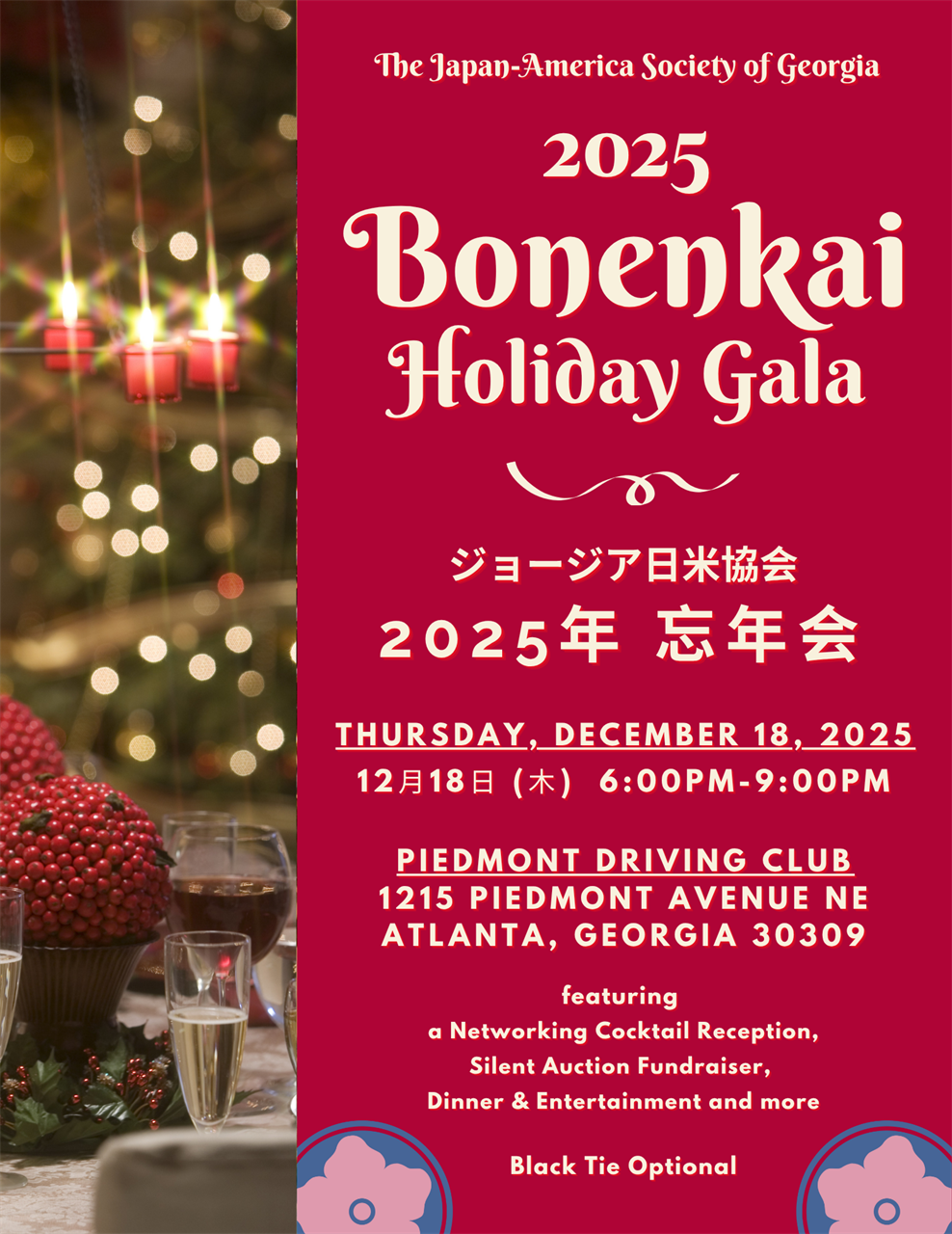 The Japan-America Society of Georgia celebrates the holidays at its 45th Bonenkai Holiday Dinner Gala on Thursday, December 18, 2025 at the Piedmont Driving Club. This year’s dinner features remarks by the new Consul General of Japan, meet & greet with Nippon Professional Baseball legends, as well as a networking cocktail reception, door prizes & performances by Junko Fujiyama.
