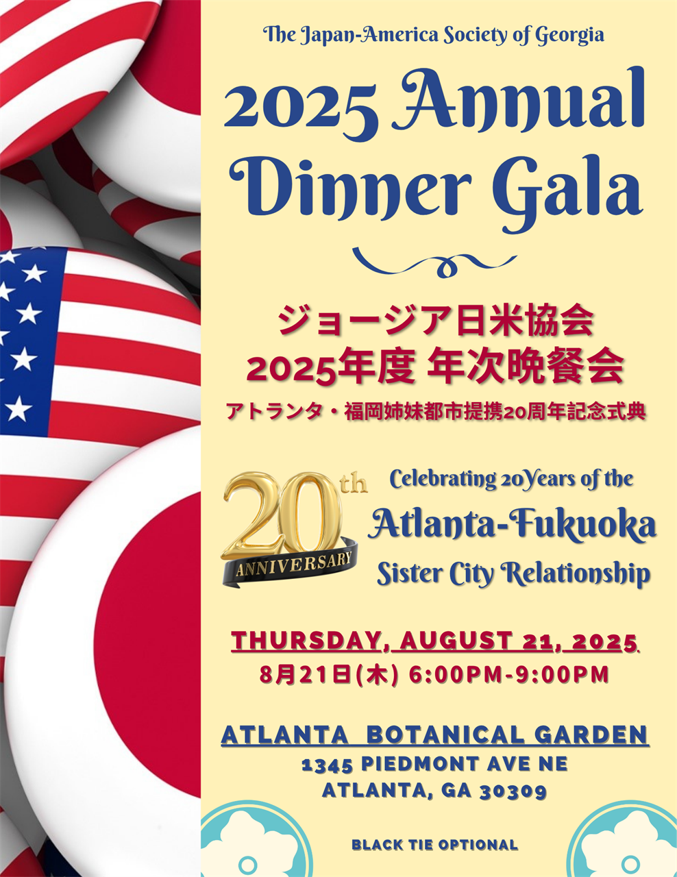As a part of its summer tradition, the Japan-America Society of Georgia will be celebrating its 45th Anniversary and the 20th Anniversary of the Atlanta-Fukuoka Sister City Relationship at the 2025 Annual Dinner Gala on Thursday, August 21, 2025, at the Atlanta Botanical Garden.