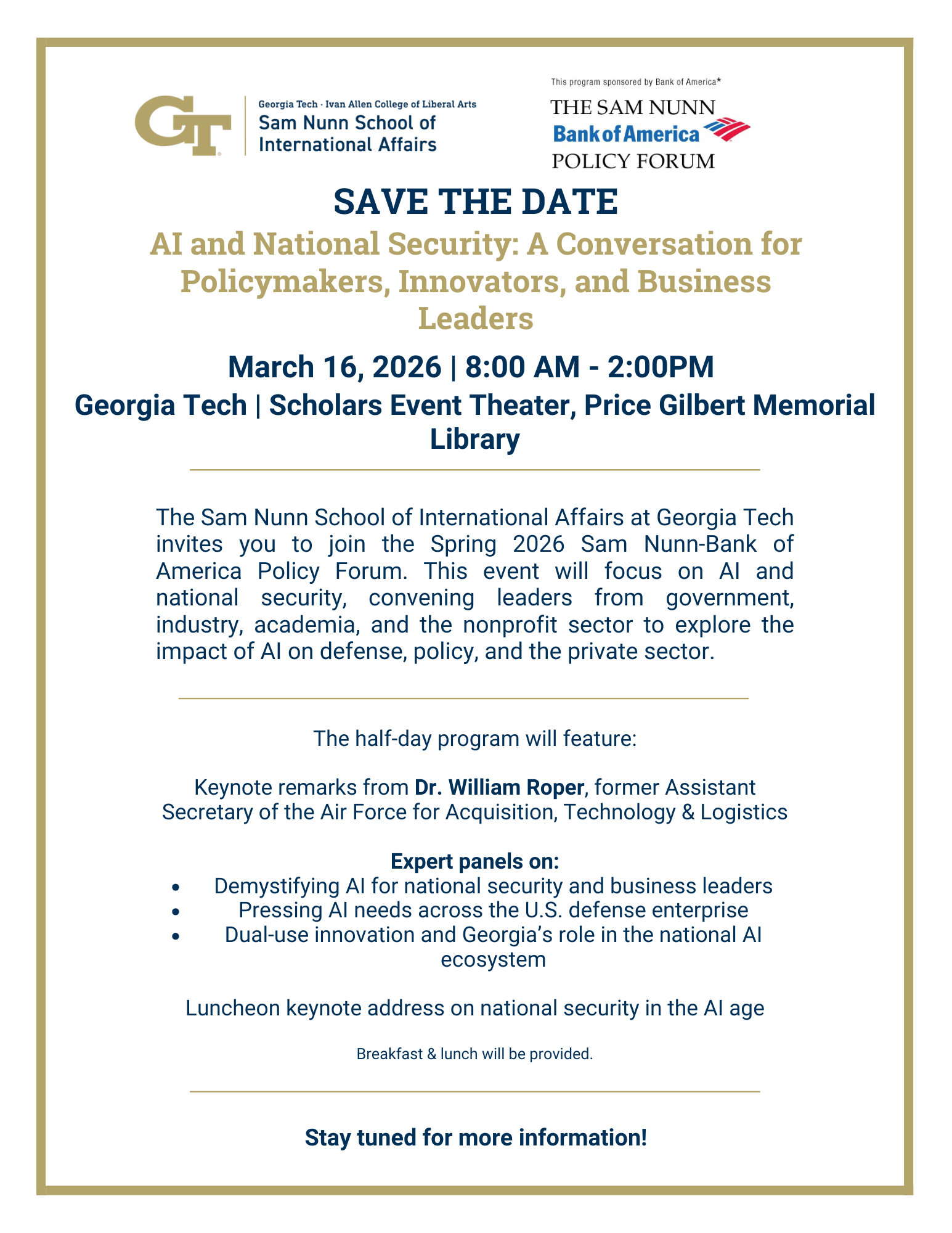 The Sam Nunn School of International Affairs at Georgia Tech invites you to join the Spring 2026 Sam Nunn-Bank of America Policy Forum.