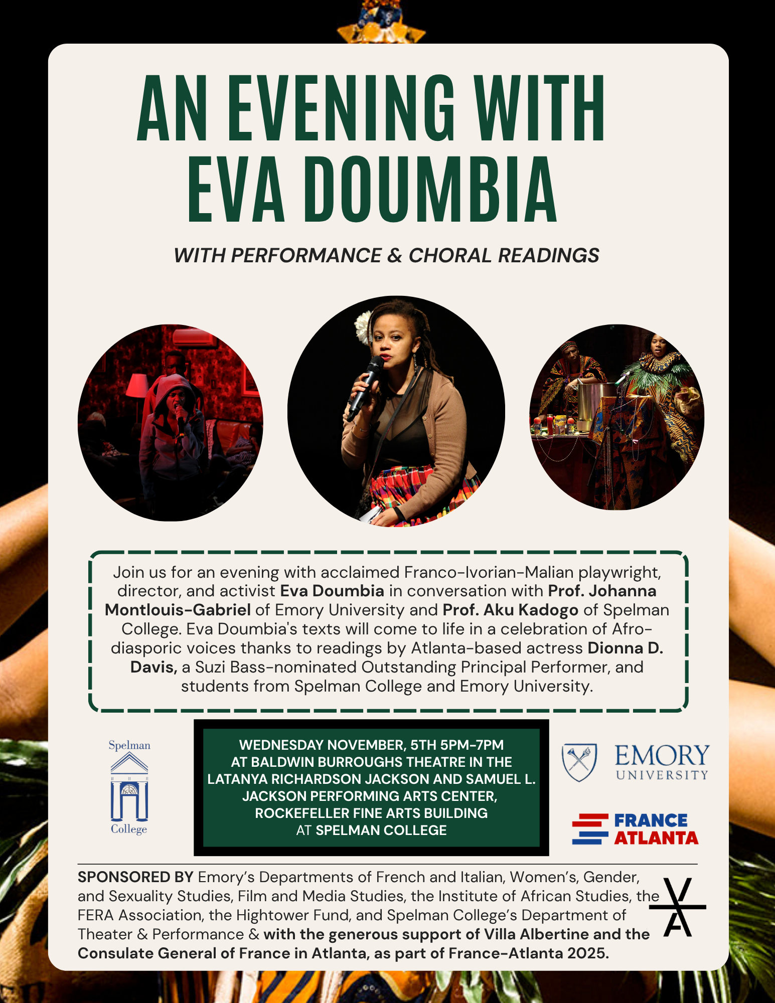 Attend on November 5 for an evening with Eva Doumbia, in conversation with Prof. Johanna Montlouis-Gabriel (Emory University), and Prof. Aku Kadogo (Spelman College). Eva Doumbia’s texts will come to life in a celebration of Afro-diasporic voices, featuring readings by Atlanta-based actress Dionna D. Davis—a Suzi Bass Award–nominated performer—and students from Emory University and Spelman College.