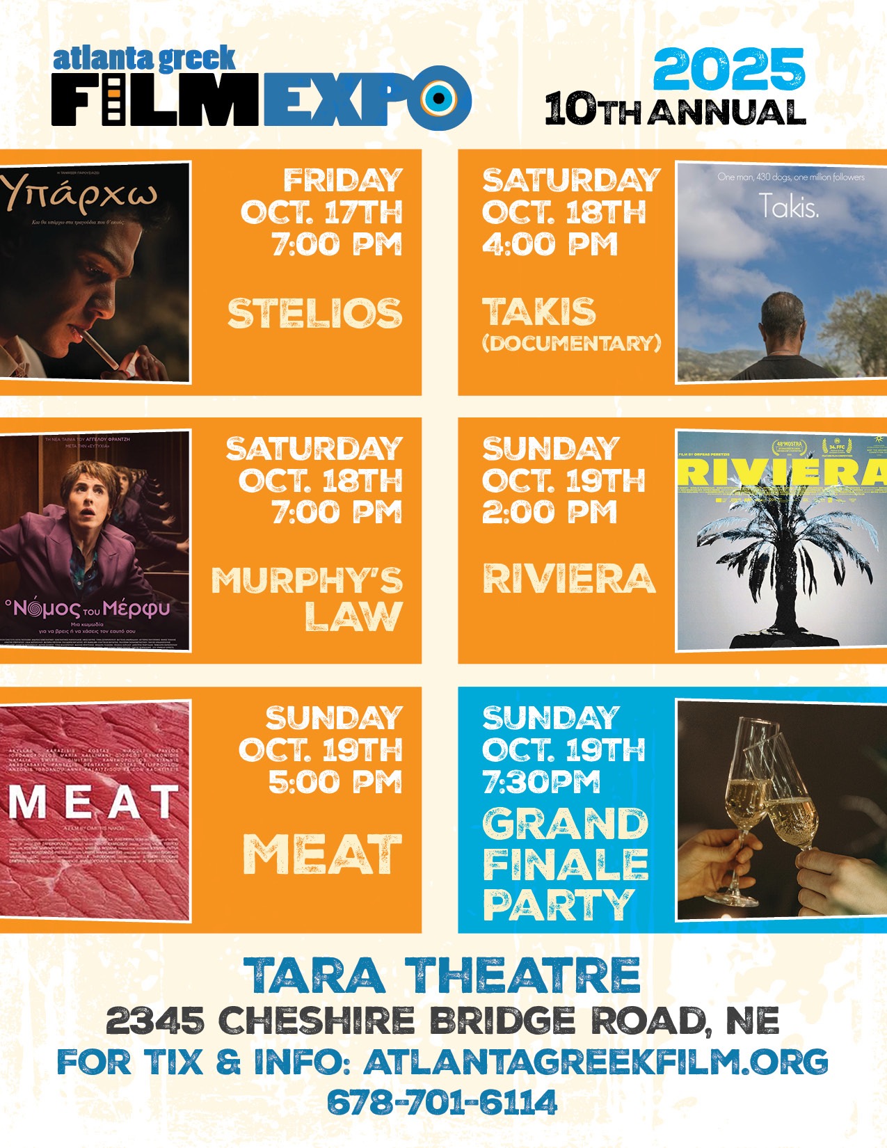 The Atlanta Greek Film Expo celebrates a decade of bringing the best of contemporary Greek cinema to Atlanta. From October 17–19, 2025 at the historic Tara Theatre on Cheshire Bridge Road, the weekend event offers a dynamic lineup of feature films, shorts, festivities, and celebrity guests.