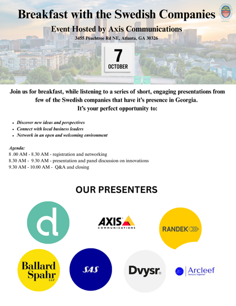 The event is focused on highlighting the Swedish businesses in Atlanta. Each presentation will be a short elevator pitch, followed by a question-and-answer session and networking opportunity after the breakfast.