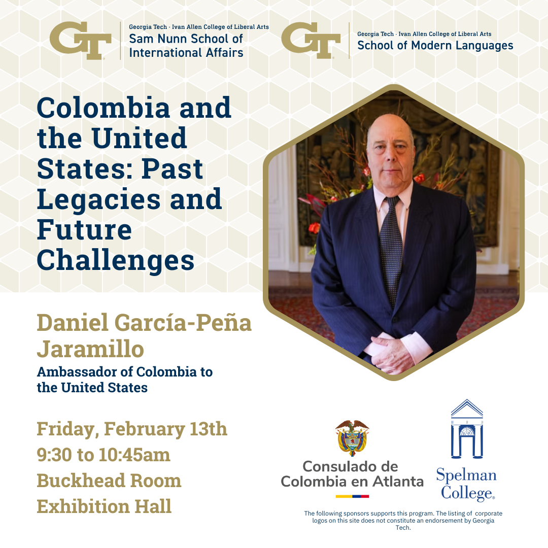 The Sam Nunn School of International Affairs, alongside the School of Modern Languages and Spelman College, is proud to host Daniel García-Peña Jaramillo, the Ambassador of Colombia to the United States. The ambassador will join to share his experience, the evolution and nature of the U.S.-Colombian relationship, and the importance of peacebuilding.