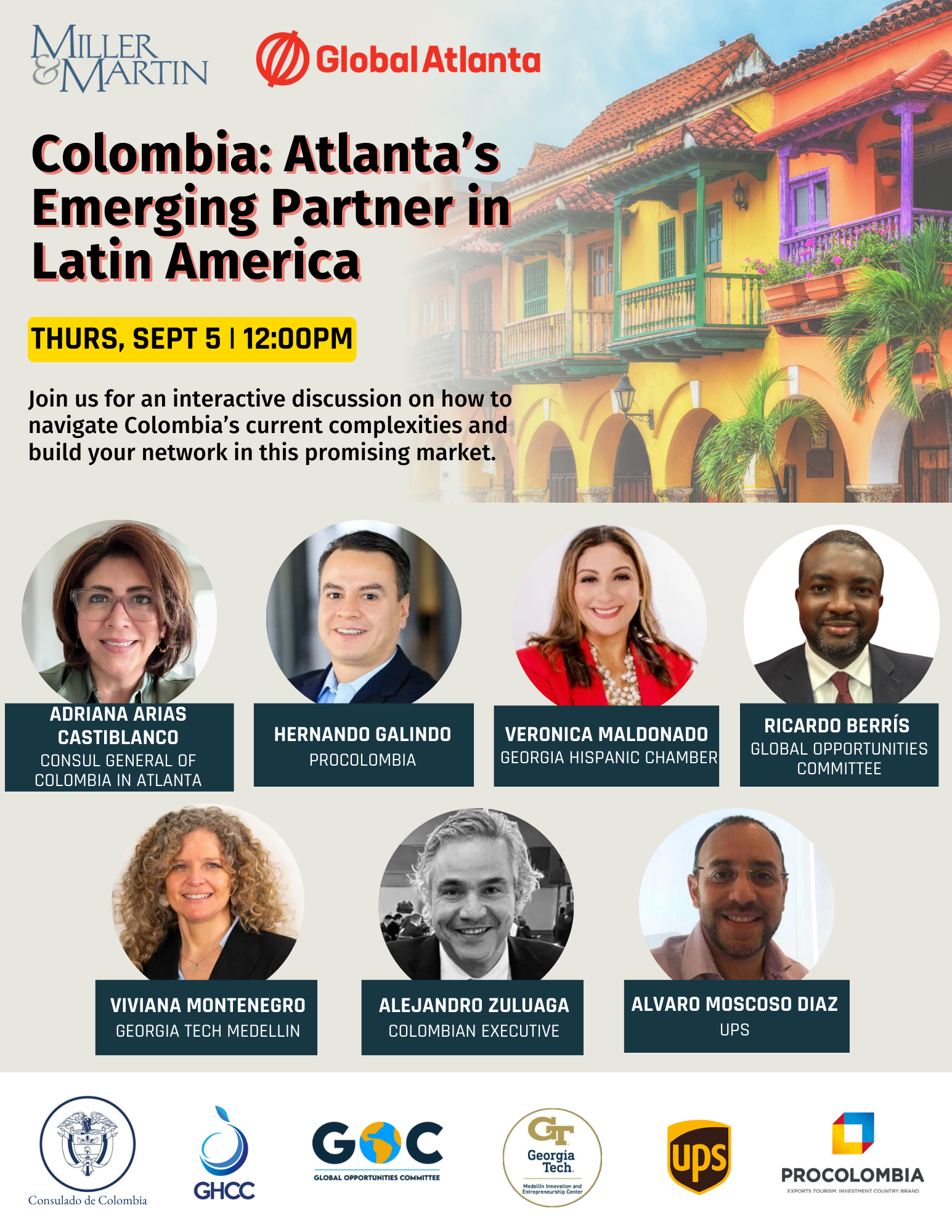 Join Global Atlanta, ProColombia, Georgia Hispanic Chamber of Commerce on Sept. 5 at Miller & Martin for an interactive discussion on how to navigate Colombia’s current complexities and build your network in this promising market.