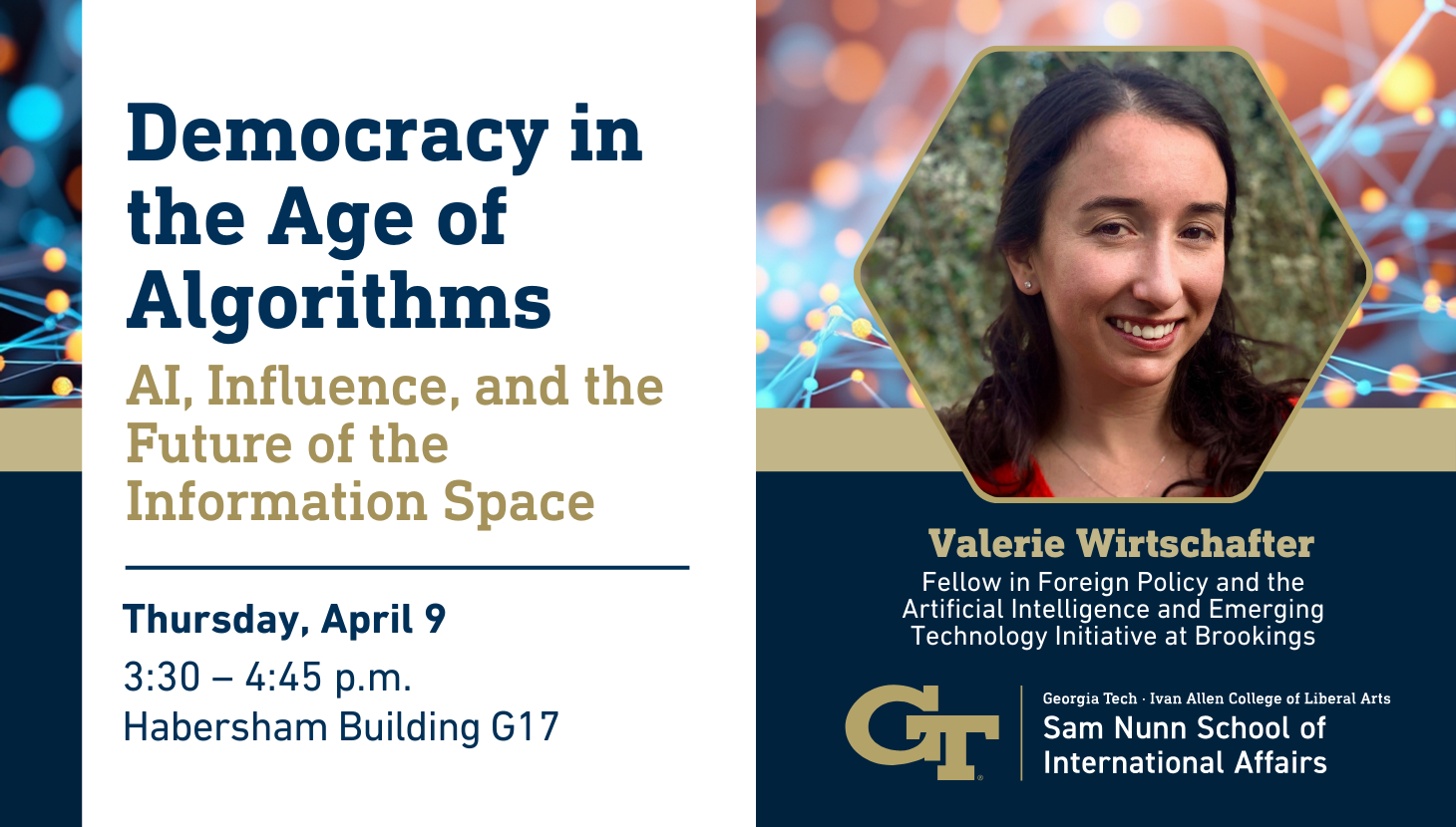 The Sam Nunn School of International Affairs is proud to welcome Valerie Wirtschafter, Fellow in Foreign Policy and the Artificial Intelligence and Emerging Technology Initiative at Brookings, for her guest lecture Democracy in the Age of Algorithms: AI, Influence, and the Future of the Information Space.