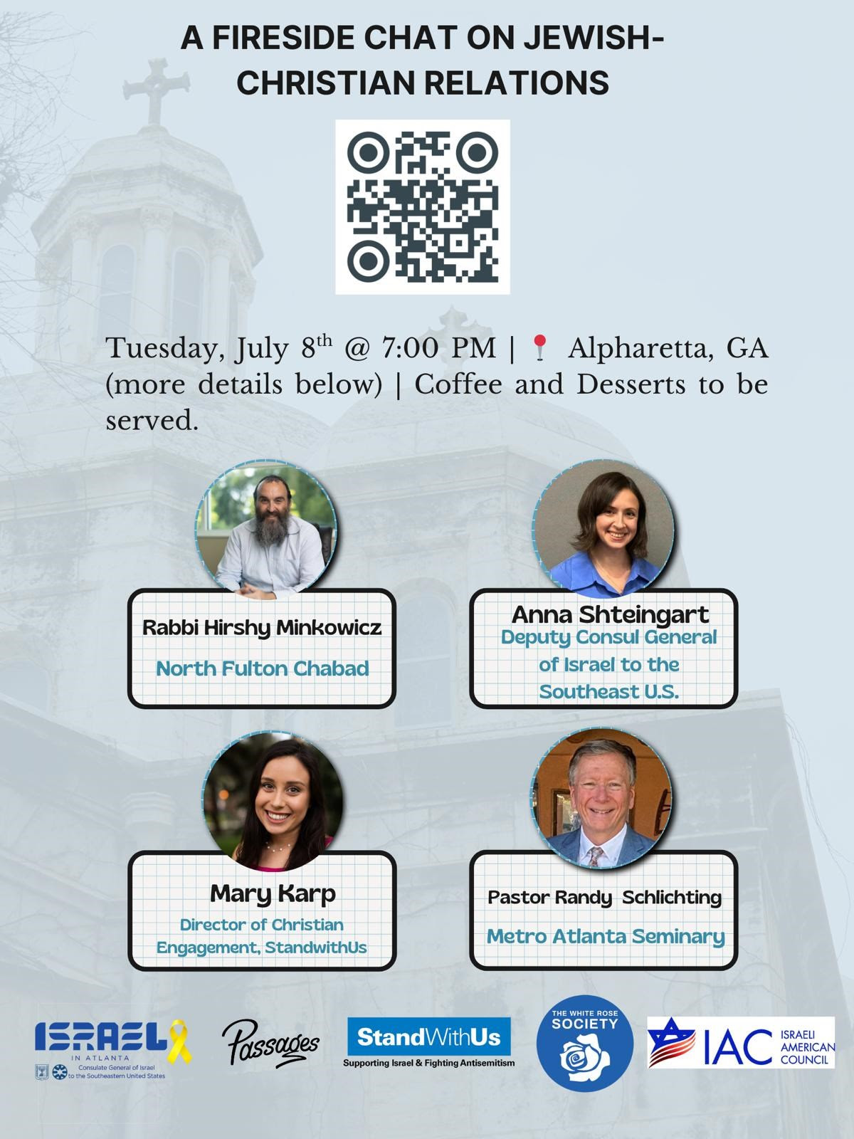 Join the Consulate General of Israel to the Southeast United States for an inspiring evening as they come together to strengthen Jewish-Christian relations in the greater Atlanta community. “Building Bridges: Jewish-Christian Relations in Atlanta” will feature esteemed speakers, insightful dialogue, and opportunities to connect across faiths. Together, they’ll explore how the Jewish and Christian communities can foster deeper connections, celebrate our commonalities, and work collaboratively toward a more united society.