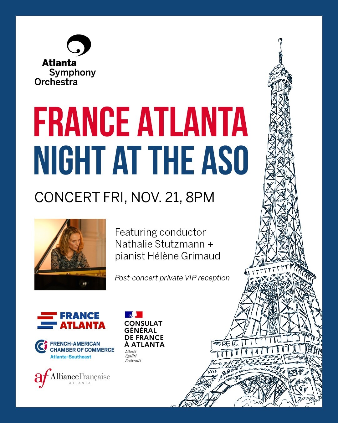 This event is organized by the Atlanta Symphony Orchestra, the Consulate General of France in Atlanta, Alliance Française Atlanta and the French-American Chamber of Commerce Atlanta-Southeast. It is a part of the 16th edition of the France-Atlanta event series. For more information about the upcoming France-Atlanta events between now and November 21, please click here.