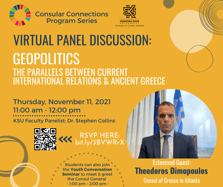 Esteemed guest speaker and Consul of Greece in Atlanta, Theodoros Dimopoulos, will break down the parallels between present day international relations and Ancient Greece and share his perspectives on how history has shaped our world today. KSU faculty member, Dr. Stephen Collins, will also sit on the panel and share his thoughts on the topic.