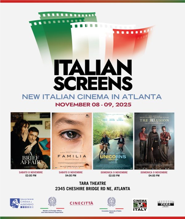 The Tara Theatre in Atlanta will serve as backdrop for this free event opening on Saturday November 8, 2025 with the films “Breve Storia d’Amore” at 2:00pm and “Familia” – which is the OFFICIAL ITALIAN ENTRY TO THE ACADEMY AWARDS – at 4:00pm and on Sunday, November 9, 2025 with the film “Unicorni” at 2:00pm and concluding with “L’Abagglio” at 4:00pm.