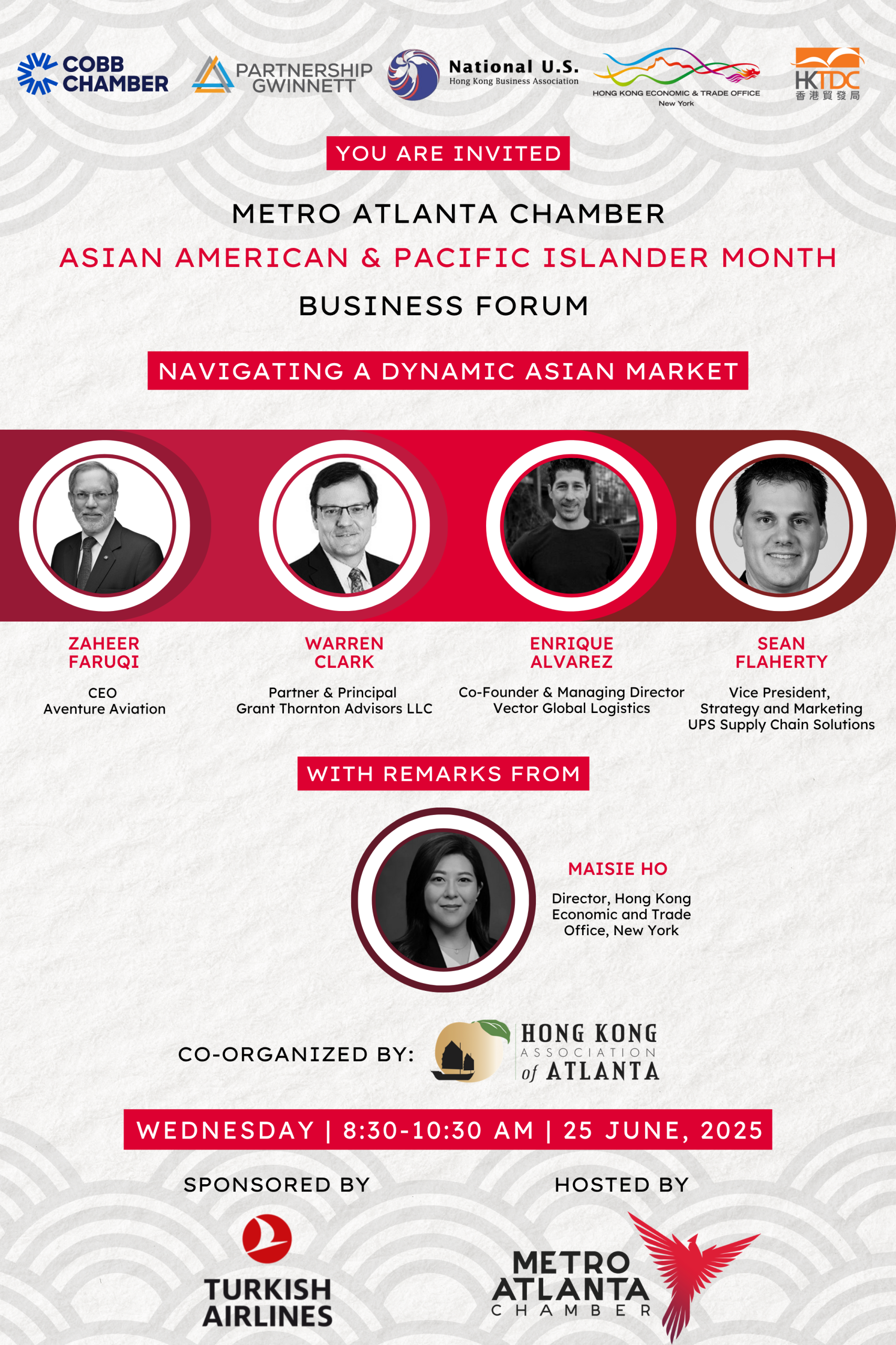 Please join the Hong Kong Association of Atlanta and the Metro Atlanta Chamber for an exclusive and timely program featuring 10 distinguished speakers and experts sharing their latest insights on tariff policies with a focus on ASEAN and North Asia.