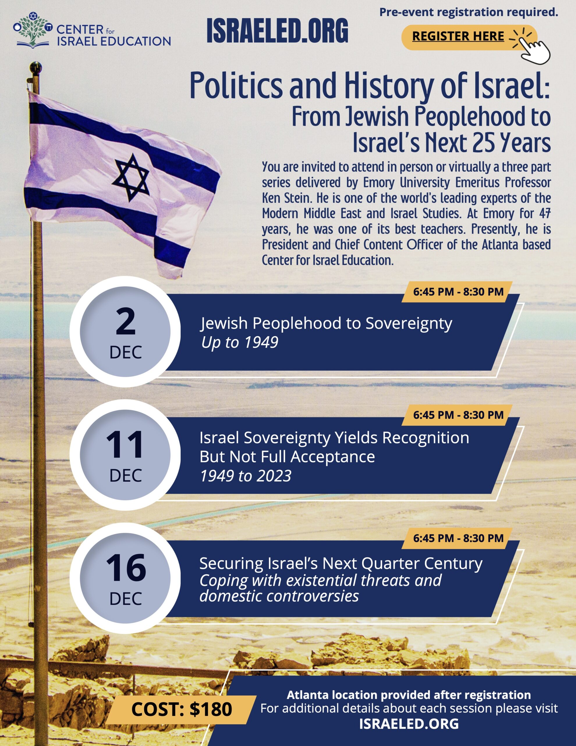 You are invited to a unique learning opportunity with Professor Kenneth Stein, one of the world’s leading experts on the modern Middle East and Israel. Go beyond the headlines and delve into the history of Israel. This series is ideal for learners of all ages. Preregistration with a fee is required. Sandy Springs location will be provided after registration. Virtual registrants will receive login information in the days prior to each presentation. Registered attendees, whether in person or online, will receive access to video recordings of all three sessions.