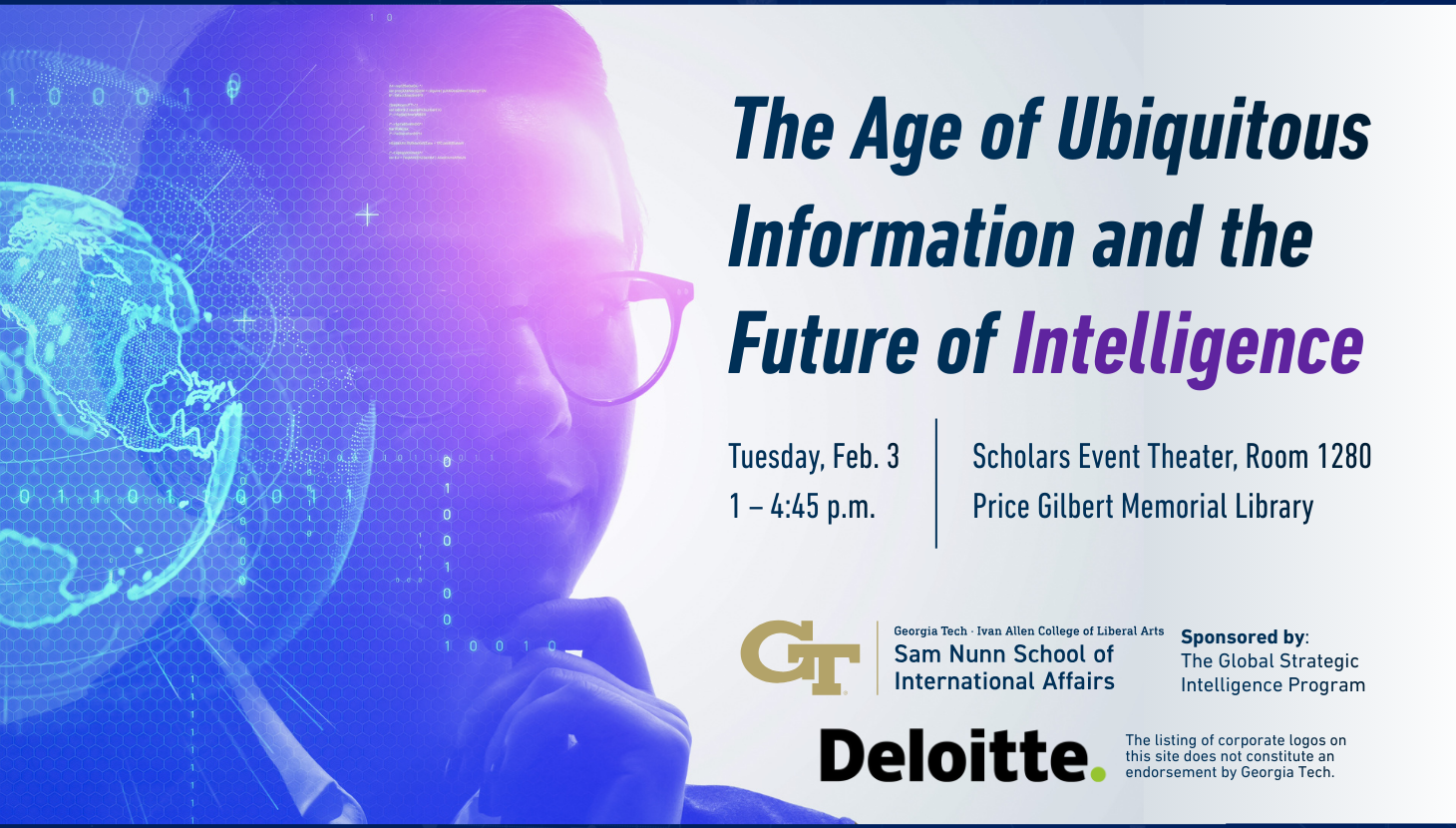 The Sam Nunn School of International Affairs at Georgia Tech invites you to join for The Age of Ubiquitous Information and the Future of Intelligence, a symposium promising to expose engineering, computer science, and international security students to the opportunities and challenges presented by open source data and new digital analytical tools for conducting intelligence and related defense and security policy analysis.