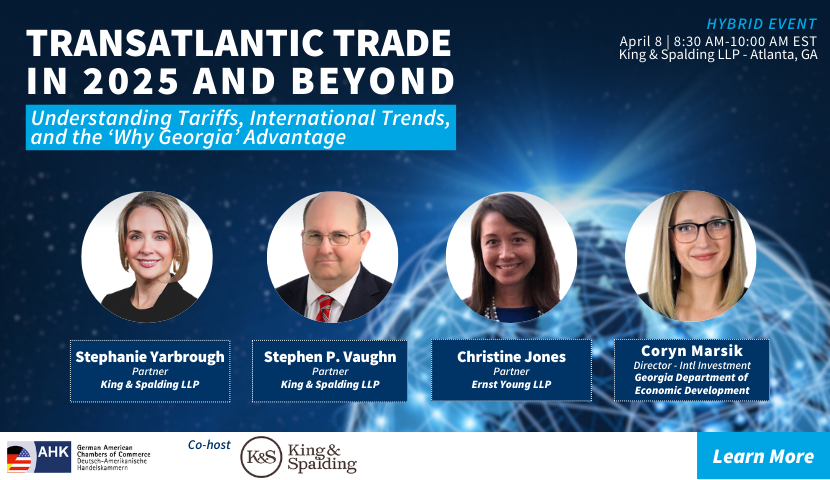 In a panel discussion including EY tax and King & Spalding, speakers will address current issues affecting transatlantic trade, including incentives to avoid fiscal or tariff-related disadvantages such as expanding or creating a business presence in the US. A representative from the Georgia Department of Economic Development will provide an overview of Georgia’s value proposition and why so many German companies have chosen the state for their US headquarters.